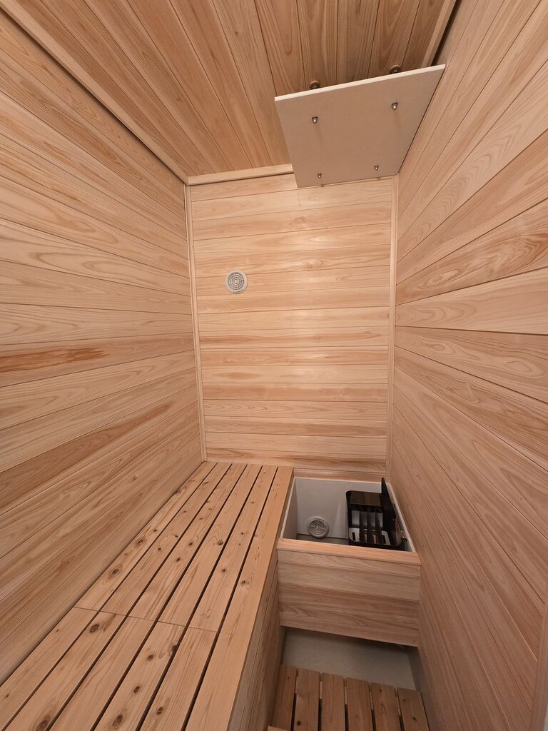 3人がゆったり入れ、足を伸ばして寝ることも出来るサイズのサウナルームです